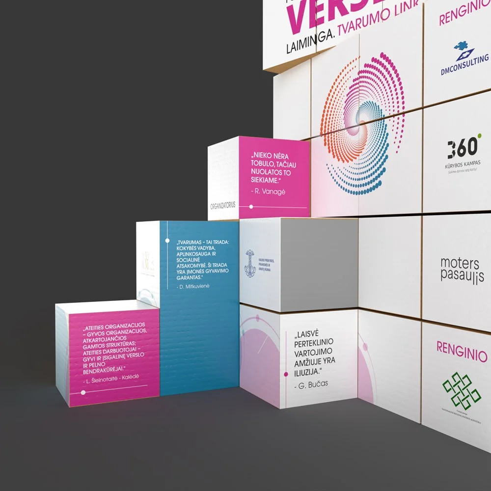 The design of the backdrop for the event has been created using a pile of carton boxes. The boxes were stacked on top of each other creating a clear and consistent image from front and side views. The design was implemented following brand guidelines of the event.